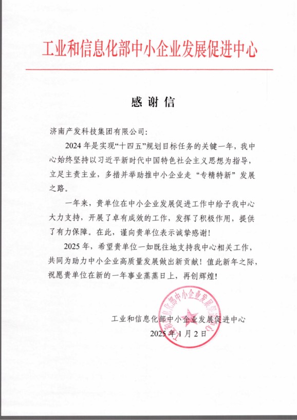近日,濟(jì)南產(chǎn)發(fā)科技集團(tuán)有限公司(以下簡(jiǎn)稱(chēng)“科技集團(tuán)”)收到一封來(lái)自工業(yè)和信息化部中小企業(yè)發(fā)展促進(jìn)中心(以下簡(jiǎn)稱(chēng)“促進(jìn)中心”)的感謝信,信中對(duì)科技集團(tuán)在2024年中小企業(yè)發(fā)展促進(jìn)工作中發(fā)揮積極作用、提供有力保障表示由衷感謝。
