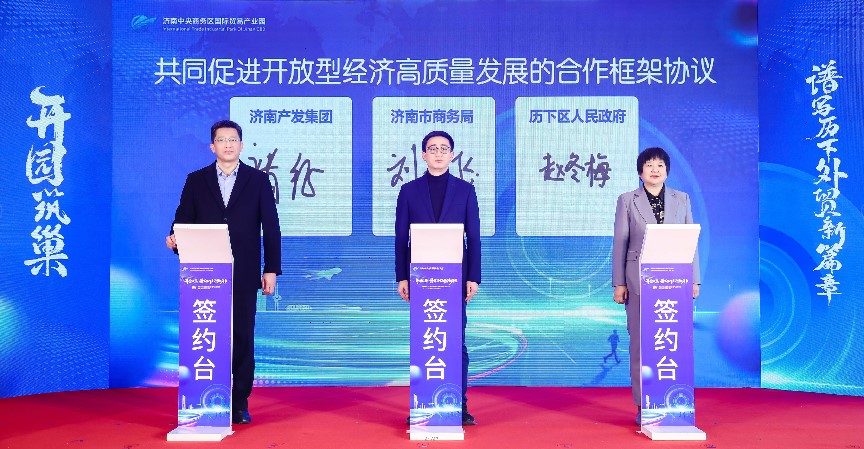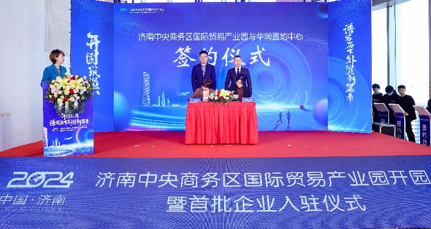 在入駐簽約環(huán)節(jié),濟南國商園區(qū)運營管理有限公司總經理陳蕾與華潤置地中心項目負責人李靜宜簽訂了委托運營協(xié)議;劉燕飛、趙冬梅、褚征分別代表濟南市商務局、濟南市歷下區(qū)人民政府、濟南產發(fā)集團共同簽署《共同促進開放型經濟高質量發(fā)展合作框架協(xié)議書》;王紅、楊傳軍、趙治文、楊福濤、王海清、黃蓓、邵丹丹共同按下啟動開園按鈕,宣告濟南中央商務區(qū)國際貿易產業(yè)園正式開園。
